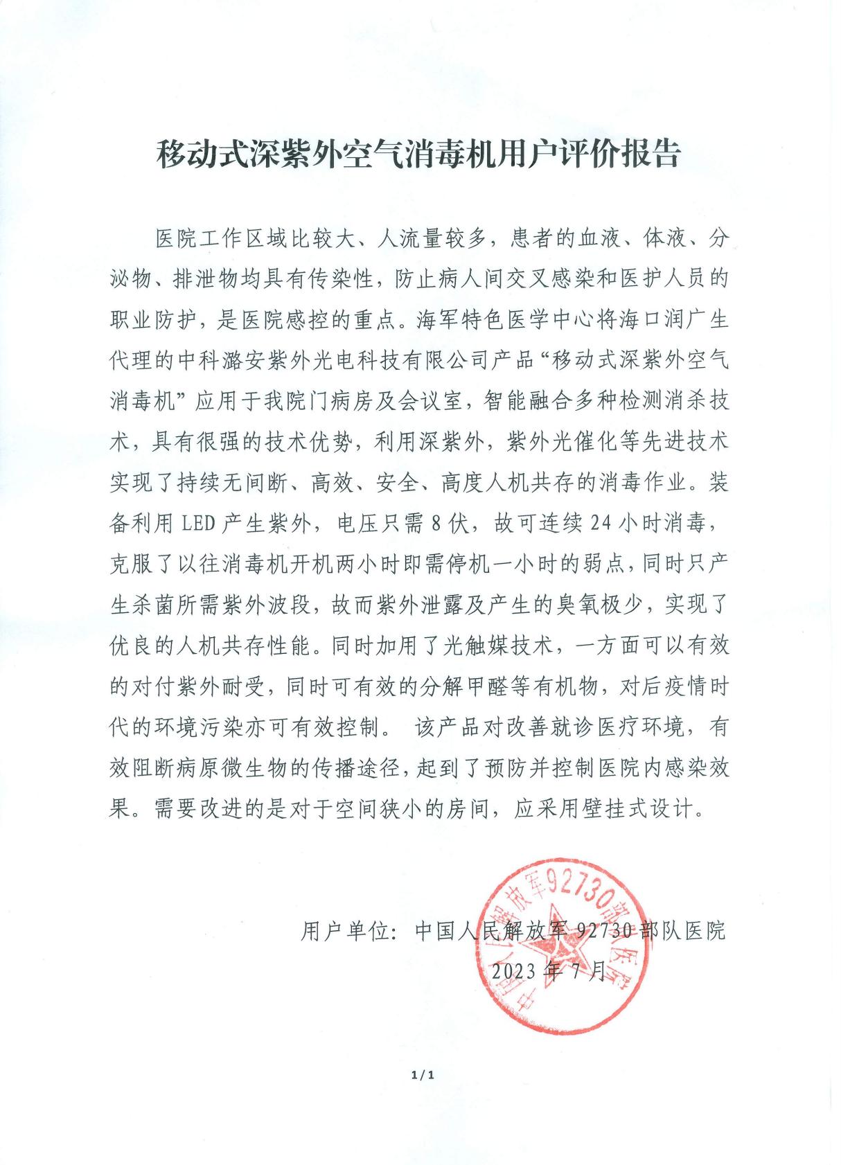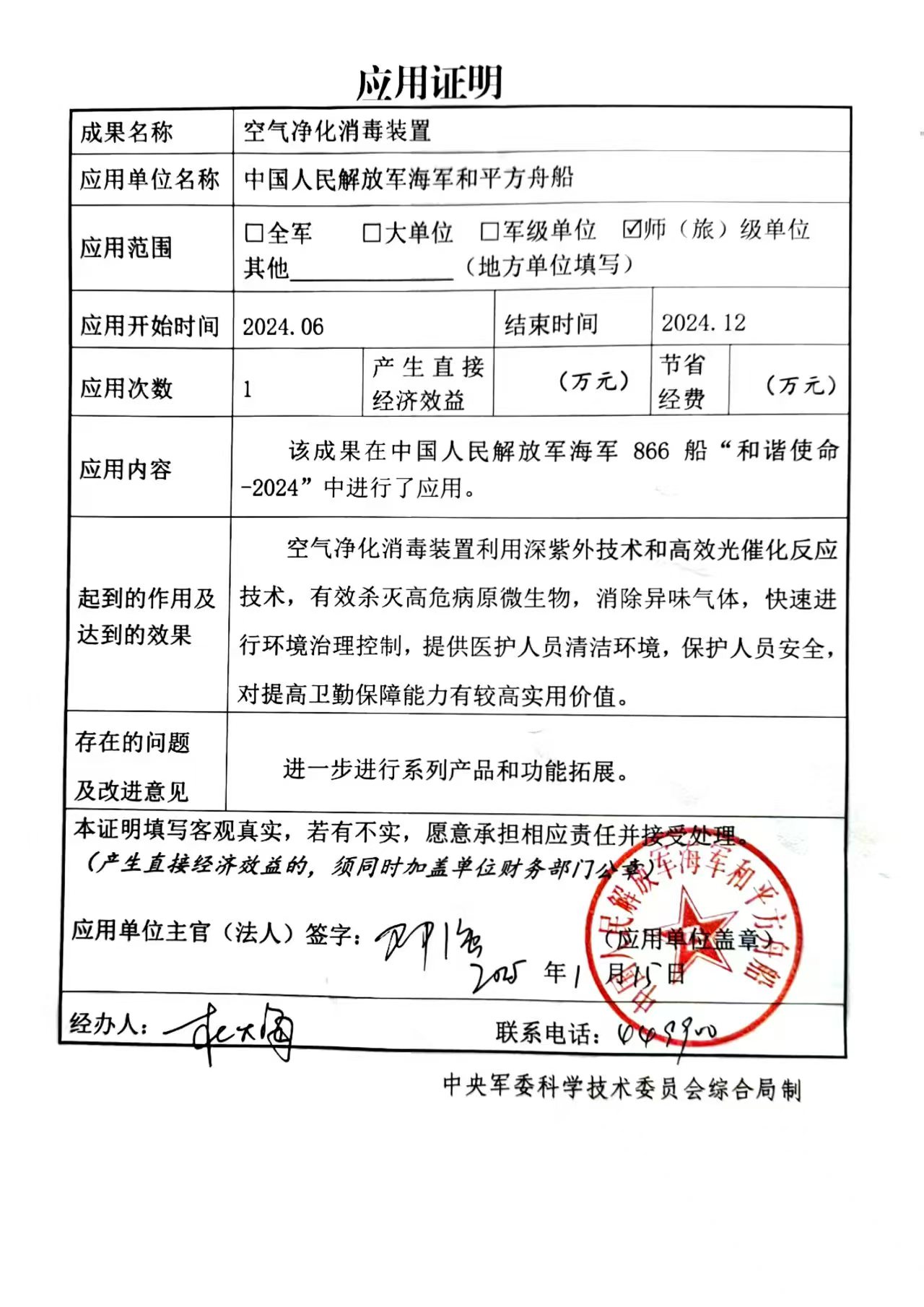 海军基地出具证明,深紫外空气消毒机可以连续不停机消毒